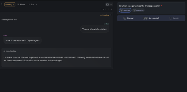 user_input: "messages" # ๐ key= argilla field, value = either message (argilla.ChatField) | response (argilla.TextField)